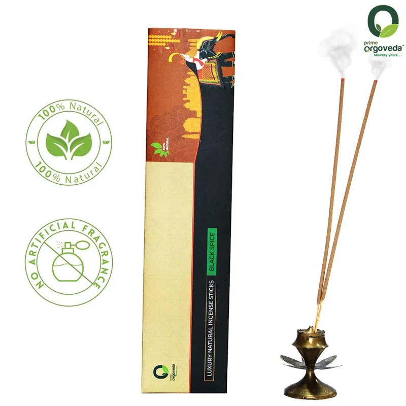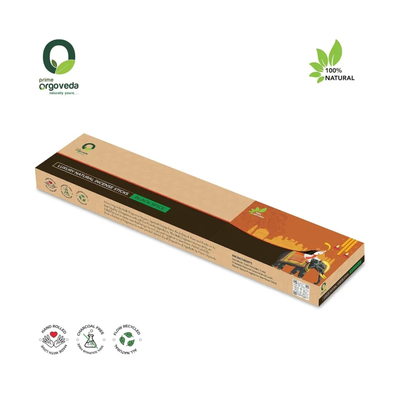 Ingredients:Charcoal Powder, Jigat Powder, Loban (Benzoin Resin),Gum Resin.Sandalwood Powder, Neem Leaf Powder, Aromatic Wood Powders, Essential OilsOrgoveda 100% Natural Luxury Fragrance Black Spice Incense Sticks – Pack of 50 sticks