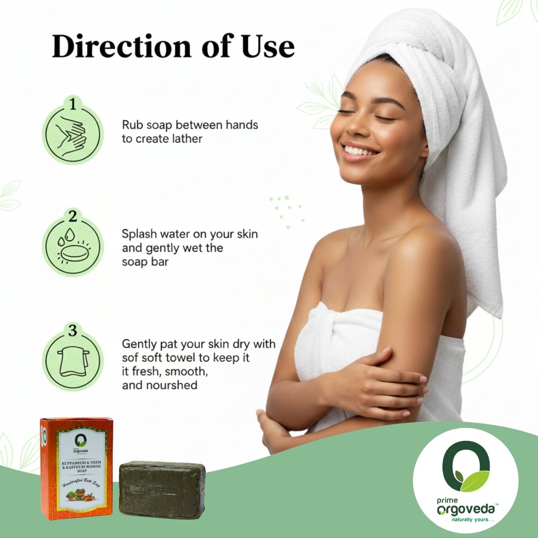 - Purifies & Detoxifies Skin: Kuppaimeni and Neem draw out impurities and help prevent acne and blackheads.