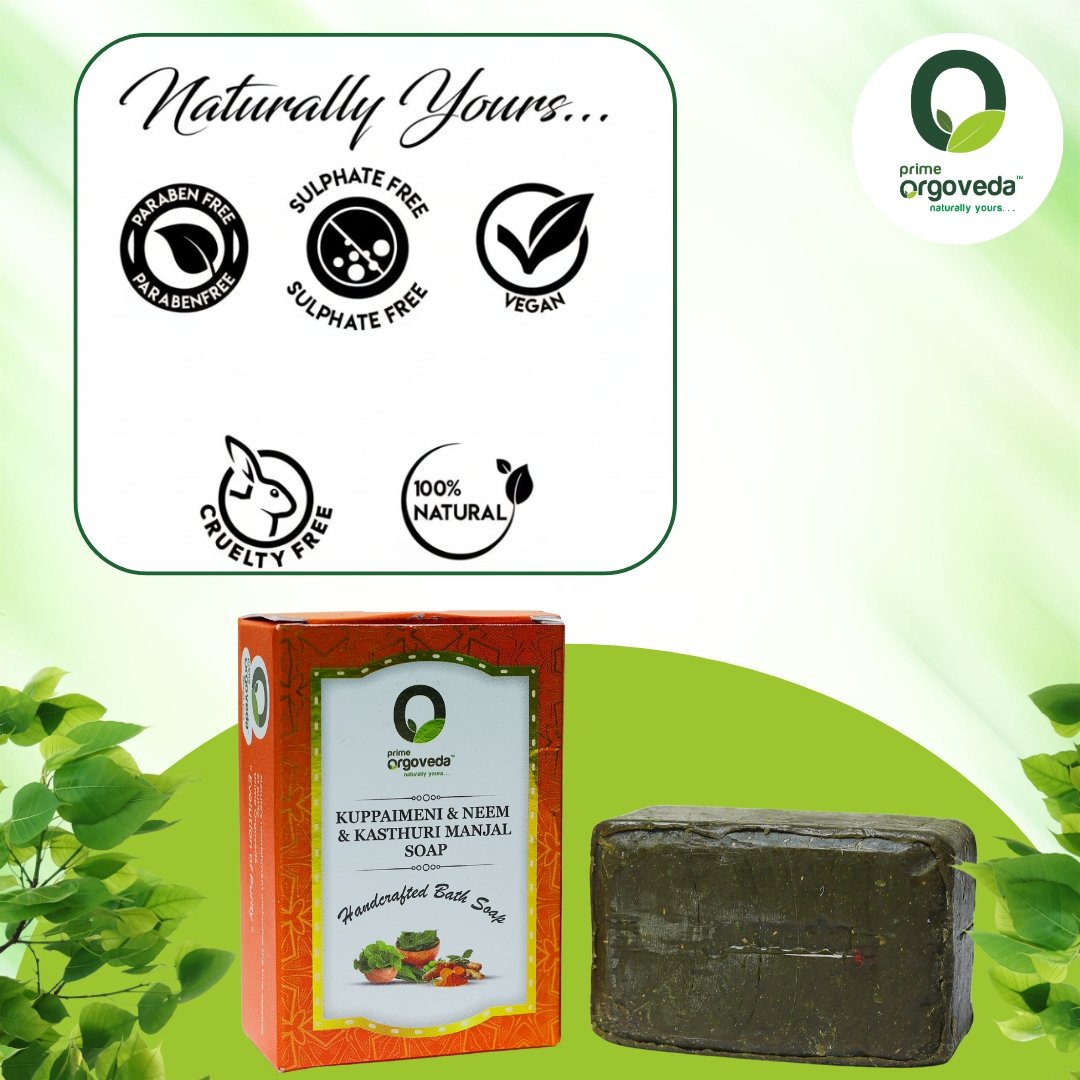 Buy Orgoveda Kuppaimeni, Neem & Kasturi Manjal Soap Online and experience the glow of Ayurveda every day!