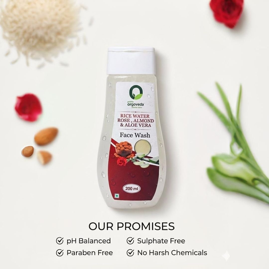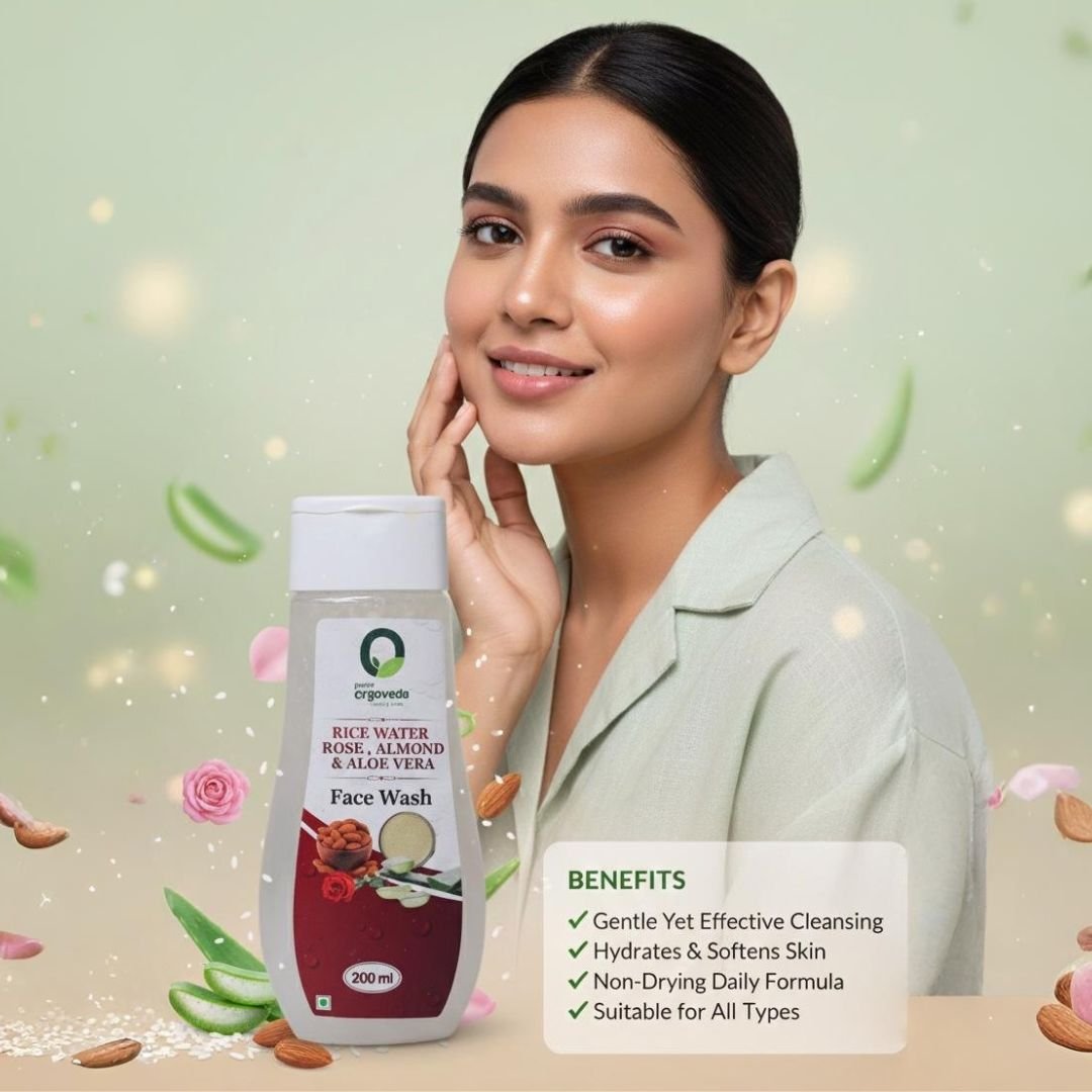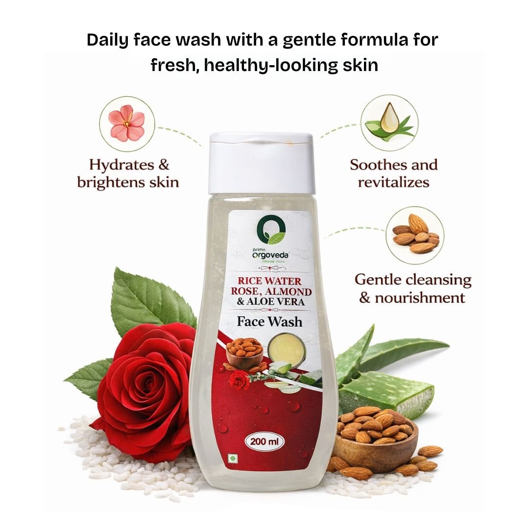 Orgoveda 100% Natural Rice Water, Rose, Almond & Aloe Vera Facewash 200ml | Brightening, Hydrating & Skin-Softening Cleanser